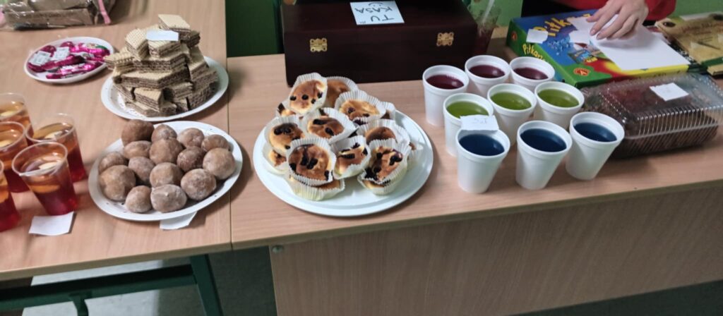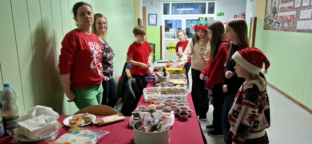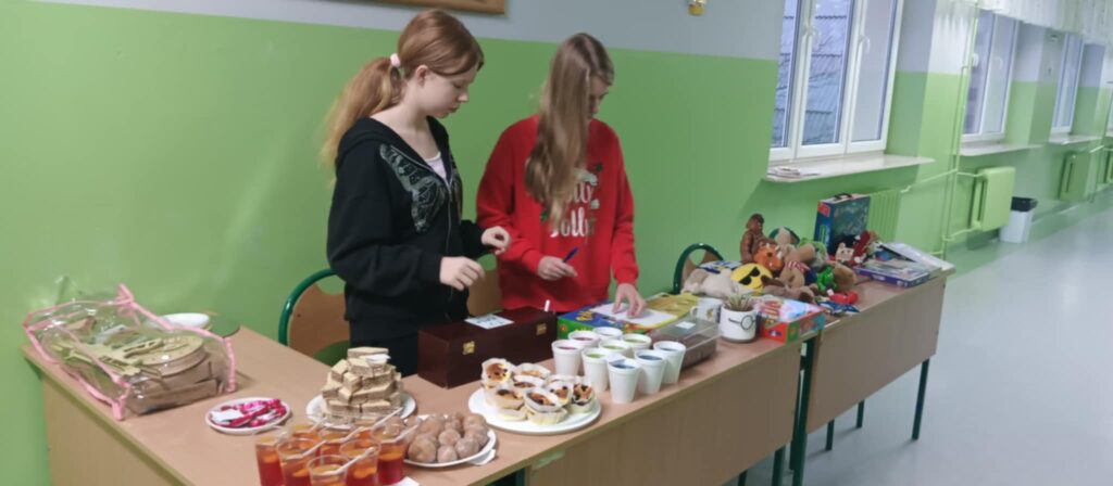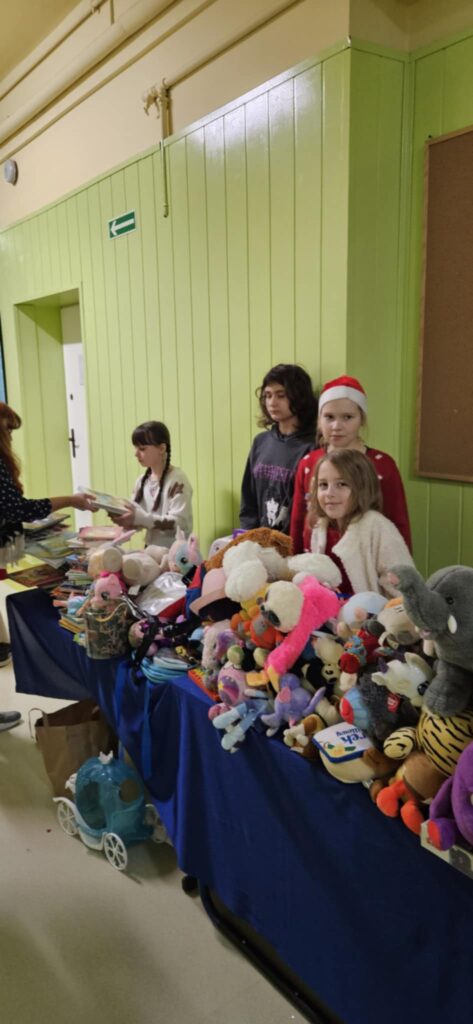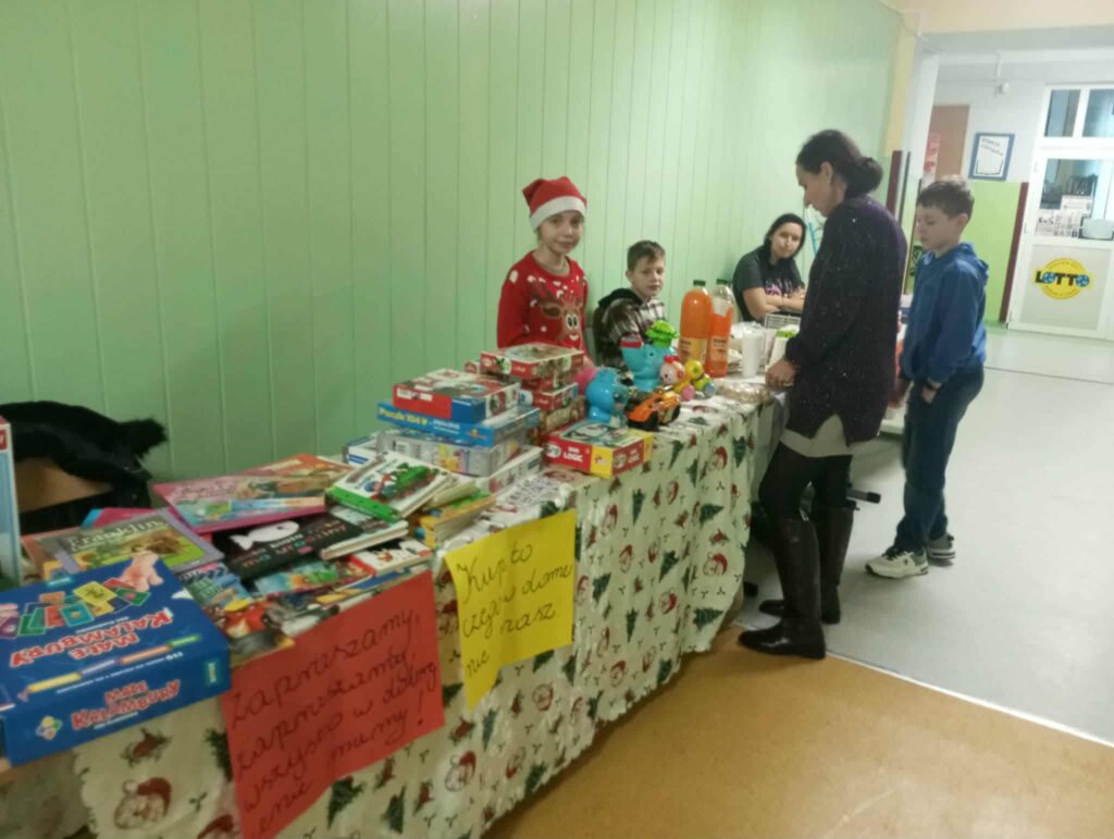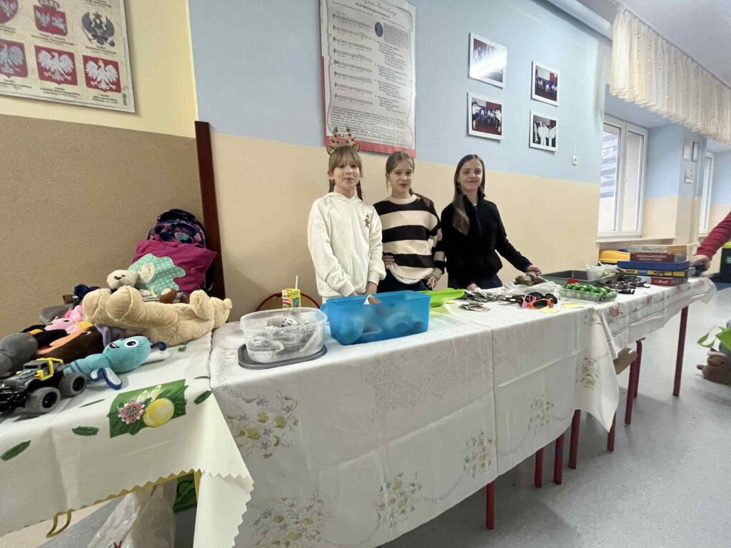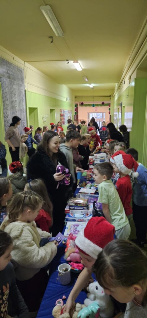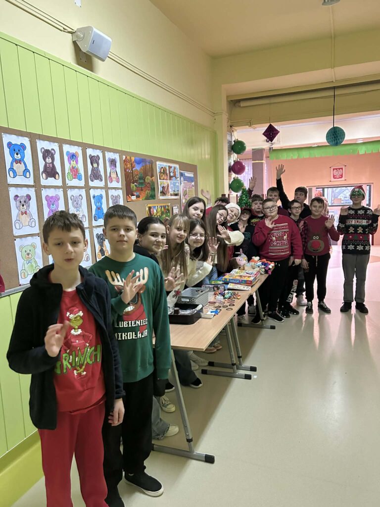 Kiermasz przedświąteczny zorganizowany w ramach akcji charytatywnej „Dzieci Dzieciom” to wydarzenie pełne ciepła, magii świąt i autentycznej radości z pomagania. Jest to inicjatywa, która łączy całą społeczność szkolną – uczniów, rodziców, nauczycieli – we wspólnym, szczytnym celu: zebraniu środków dla potrzebujących rówieśników. Szkolne korytarze zamieniły się w magiczną, pachnącą świętami przestrzeń. Stoły uginały się od domowych wypieków, książek, zabawek i różnorodnych gier. Wszyscy, od najmłodszych trzecioklasistów po młodzież z klas ósmych, byli zaangażowani w działania pomocowe.