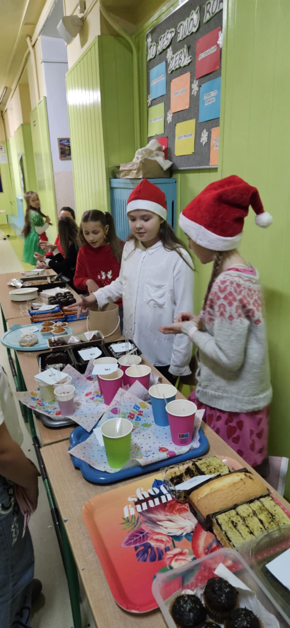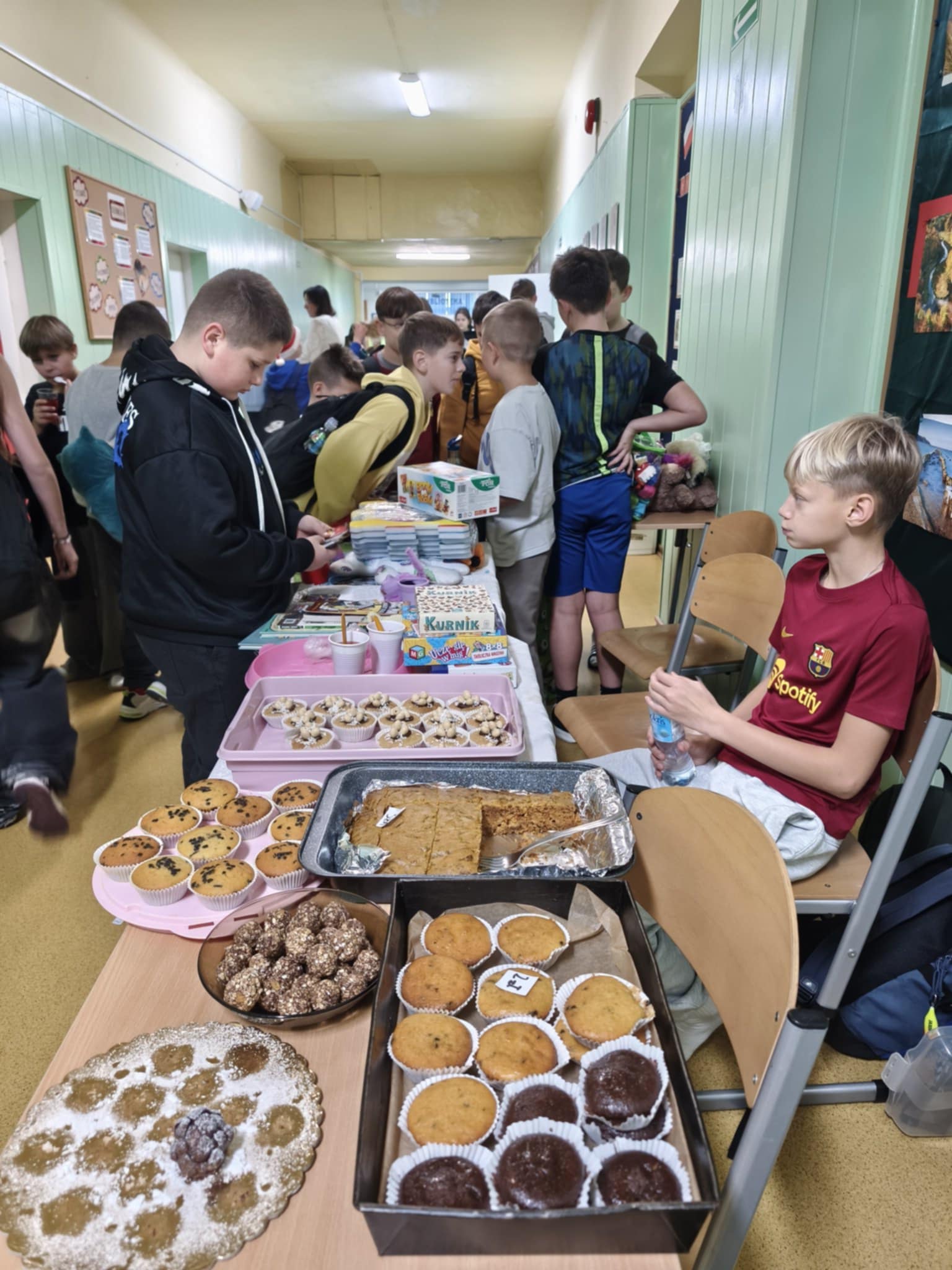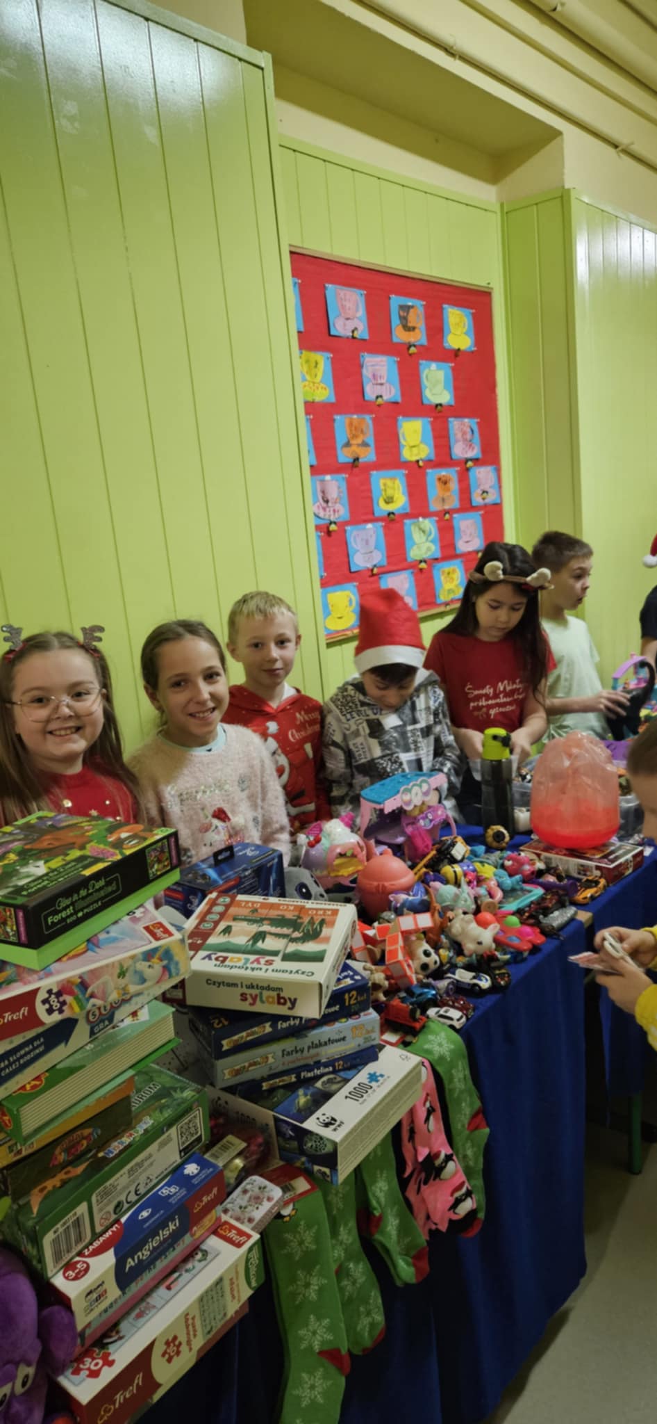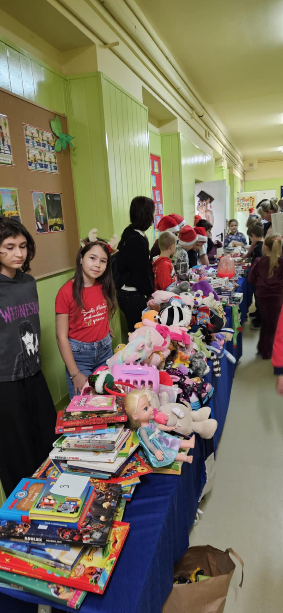 Kiermasz przedświąteczny zorganizowany w ramach akcji charytatywnej „Dzieci Dzieciom” to wydarzenie pełne ciepła, magii świąt i autentycznej radości z pomagania. Jest to inicjatywa, która łączy całą społeczność szkolną – uczniów, rodziców, nauczycieli – we wspólnym, szczytnym celu: zebraniu środków dla potrzebujących rówieśników. Szkolne korytarze zamieniły się w magiczną, pachnącą świętami przestrzeń. Stoły uginały się od domowych wypieków, książek, zabawek i różnorodnych gier. Wszyscy, od najmłodszych trzecioklasistów po młodzież z klas ósmych, byli zaangażowani w działania pomocowe.