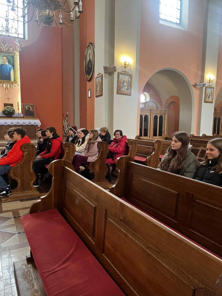 Pierwszym punktem programu było zwiedzanie kościoła parafialnego w Smardzewie. Uczniowie mieli okazję poznać historię świątyni, jej zabytkową architekturę oraz wysłuchać krótkiej prelekcji księdza Henryka Dymka o życiu parafii na przestrzeni wieków. Szczególne wrażenie zrobiły obrazy i relikwie św. Jana Pawła II, św. siostry Faustyny, św. Andrzeja Boboli i błogosławionego kardynała Stefana Wyszyńskiego. Następnie uczniowie udali się na grób Nieznanego Żołnierza z 1920 roku, upamiętniający żołnierza poległego w czasie wojny polsko-bolszewickiej. W ciszy zapalili znicze i rozmawiali o poświęceniu młodych ludzi w obronie niepodległości Polski.