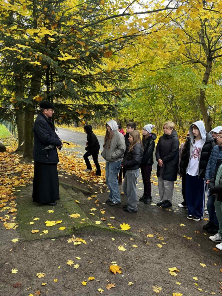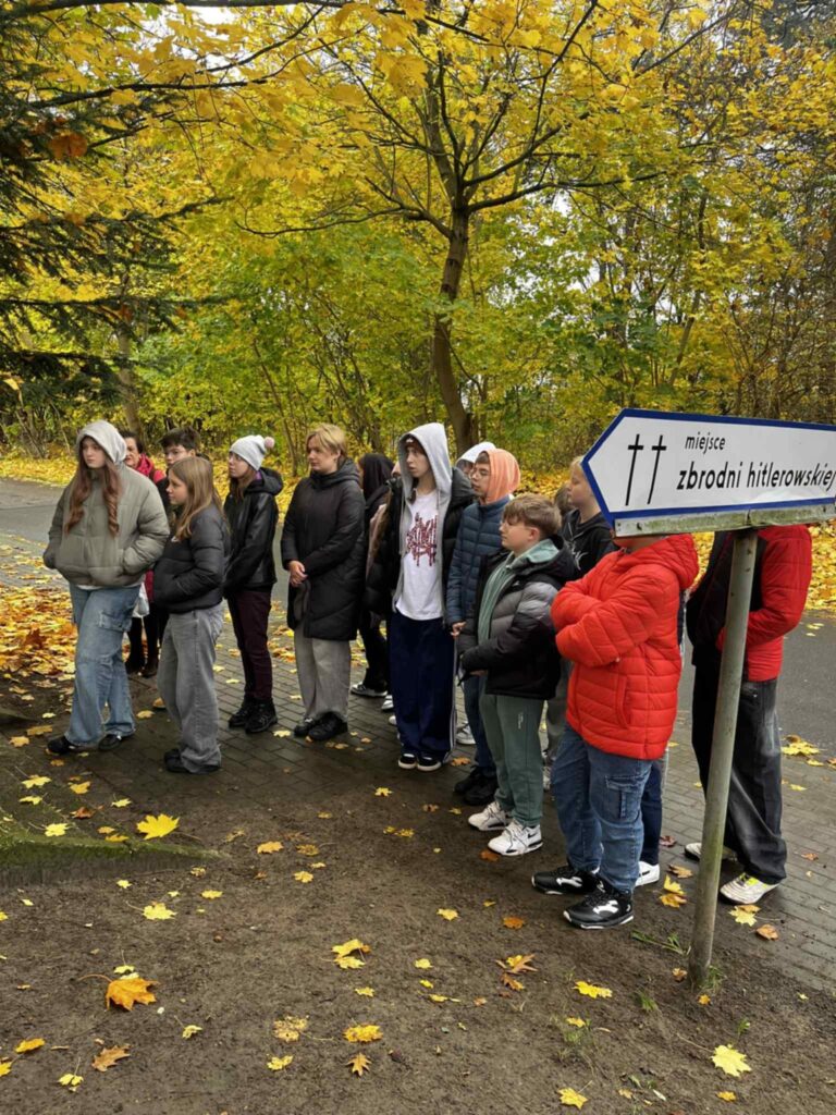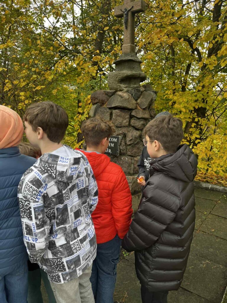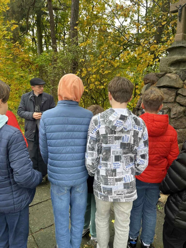Ostatnim punktem wycieczki był pomnik ofiar obozu dla Polaków i Żydów, który upamiętnia tragiczne wydarzenia z okresu II wojny światowej. To miejsce wzbudziło szczególną refleksję i zadumę nad losem ludzi, którzy zginęli w wyniku działań okupanta. Uczniowie zapalili znicze i oddali hołd wszystkim ofiarom wojny.