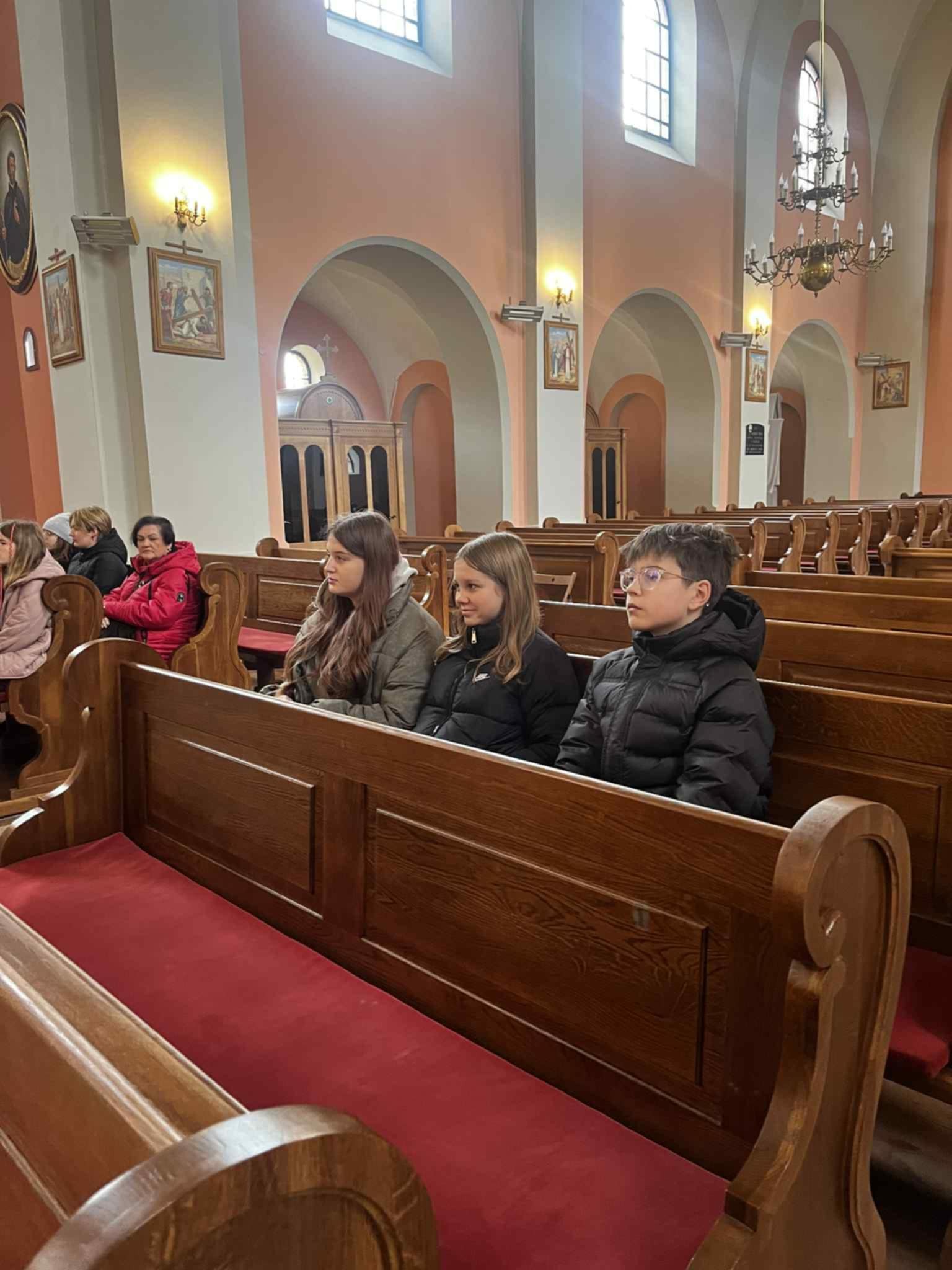 Pierwszym punktem programu było zwiedzanie kościoła parafialnego w Smardzewie. Uczniowie mieli okazję poznać historię świątyni, jej zabytkową architekturę oraz wysłuchać krótkiej prelekcji księdza Henryka Dymka o życiu parafii na przestrzeni wieków. Szczególne wrażenie zrobiły obrazy i relikwie św. Jana Pawła II, św. siostry Faustyny, św. Andrzeja Boboli i błogosławionego kardynała Stefana Wyszyńskiego. Następnie uczniowie udali się na grób Nieznanego Żołnierza z 1920 roku, upamiętniający żołnierza poległego w czasie wojny polsko-bolszewickiej. W ciszy zapalili znicze i rozmawiali o poświęceniu młodych ludzi w obronie niepodległości Polski.