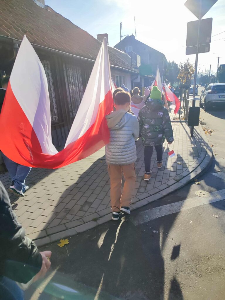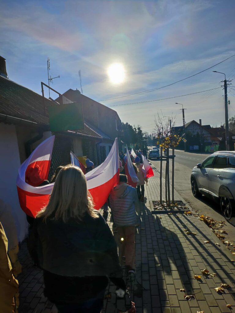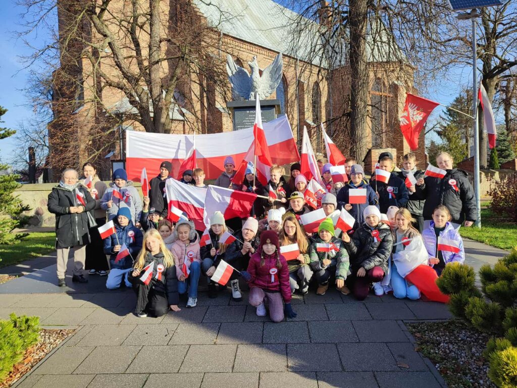 Każde dziecko, z flagą dumnie powiewającą w dłoni i kotylionem na piersi, maszerowało z powagą i radością. Pierwszym przystankiem był pomnik Żołnierzy Polskich poległych w 1920 usytuowany przed majestatycznym kościołem pw. Jana Chrzciciela. To miejsce, gdzie kamień szepcze o historii. Tam, w blasku słońca, uczniowie złożyli hołd tym, którzy walczyli o wolność.